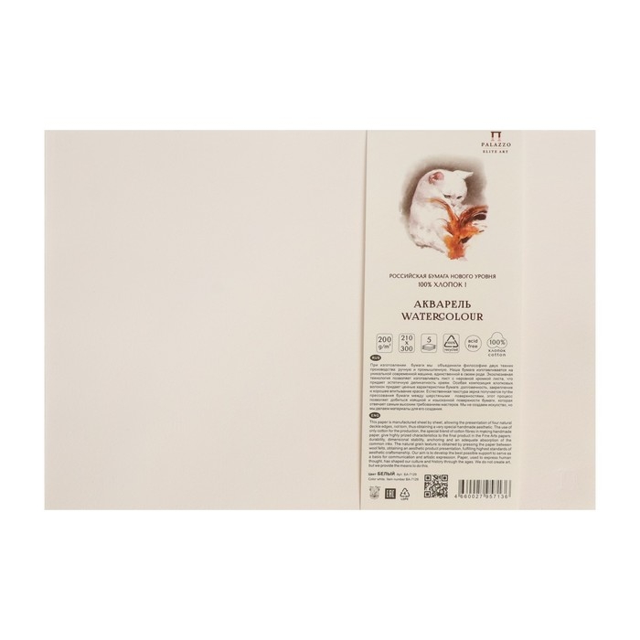 Бумага для акварели с хлопком 210х300, 5 листов, 100% хлопок, 200 г/м2, белая