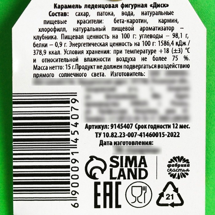 Состав: сахар, патока, вода, натуральные пищевые красители: бета-каротин, кармин, хлорофилл, натуральный пищевой ароматизатор – клубника.