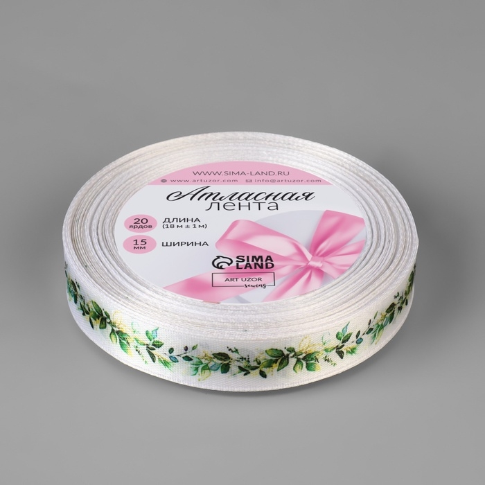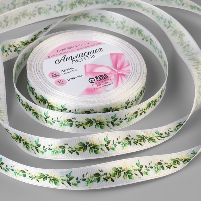 Лента атласная «Весенние листочки», 15 мм × 18 ± 1 м, цвет белый