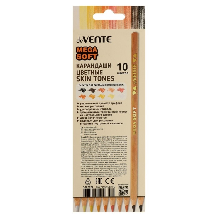Карандаши 10 цветов, deVENTE Skin Tones (ОТТЕНКИ КОЖИ), супер мягкий грифель на масляной основе, диаметр грифеля 4 мм, трехгранные, в картонной коробке.