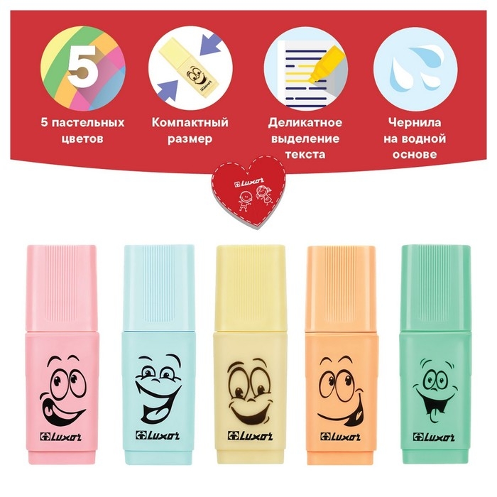 Текстовыделитель Luxor Eyeliter Pastel на водной основе представлен со скошенным пишущим узлом. Компактный размер 24 х 14,7 мм идеально подходит для пенала или сумочки. Пастельные чернила уменьшают нагрузку на зрение, не затемняют текст и подходят для выделения, эскизов, надписей. Текстовыделители нежно выделяют, быстро сохнут и не оставляют разводов и имеют привлекательный дизайн. Набор упакован в блистер с европодвесом.