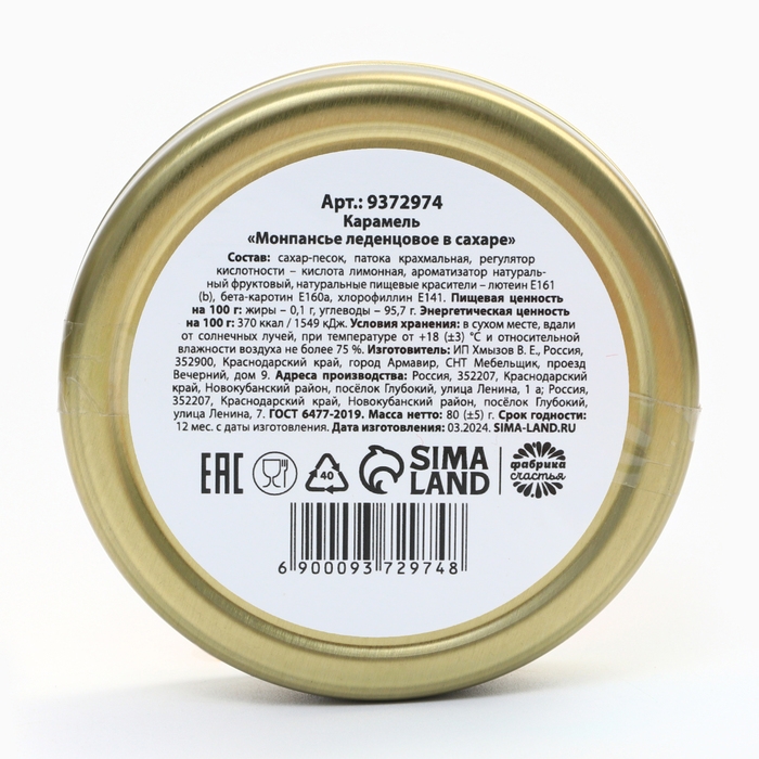 Состав: сахар-песок, патока крахмальная, регулятор кислотности – кислота лимонная, ароматизатор натуральный фруктовый, натуральные пищевые красители – лютеин Е161(b), бета-каротин Е160a, хлорофиллин Е141.