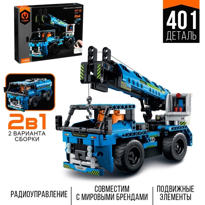 - Два варианта сборки: автокран и грузовик, которые дети могут поочередно создавать и разбирать.