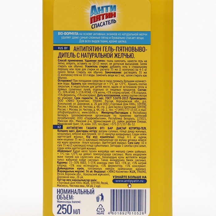Гель пятновыводитель, Антипятин,спасатель с натуральной желчью, 250 мл