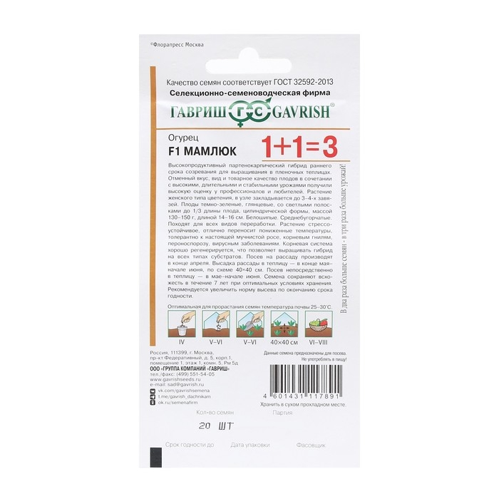 Семена Огурец "Мамлюк", F1, серия 1+1, 20 шт