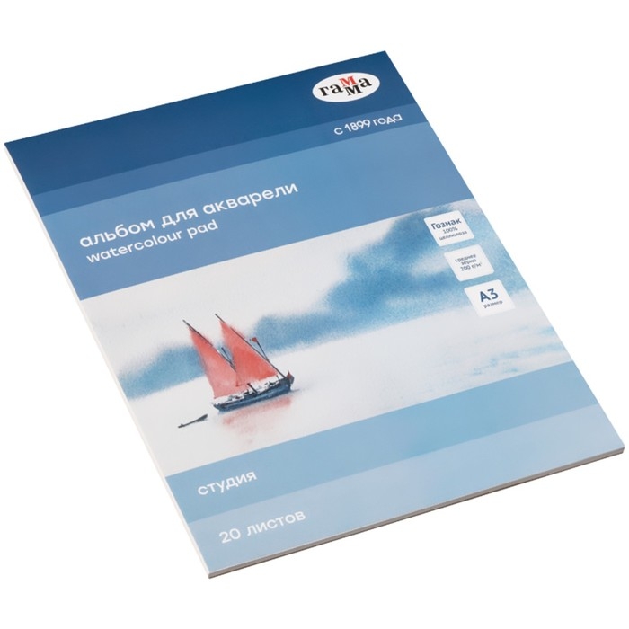 Альбом для Акварели А3 20 листов, 200 гм/2, Гамма "Студия", на склейке, среднее зерно (30C01G720W)