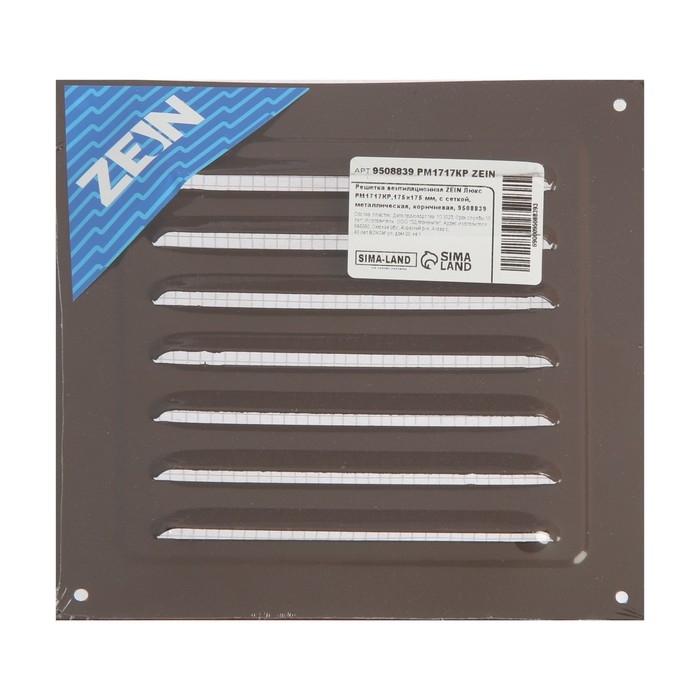 Решетка вентиляционная ZEIN Люкс РМ1717КР, 175 х 175 мм, с сеткой, металлическая, коричневая