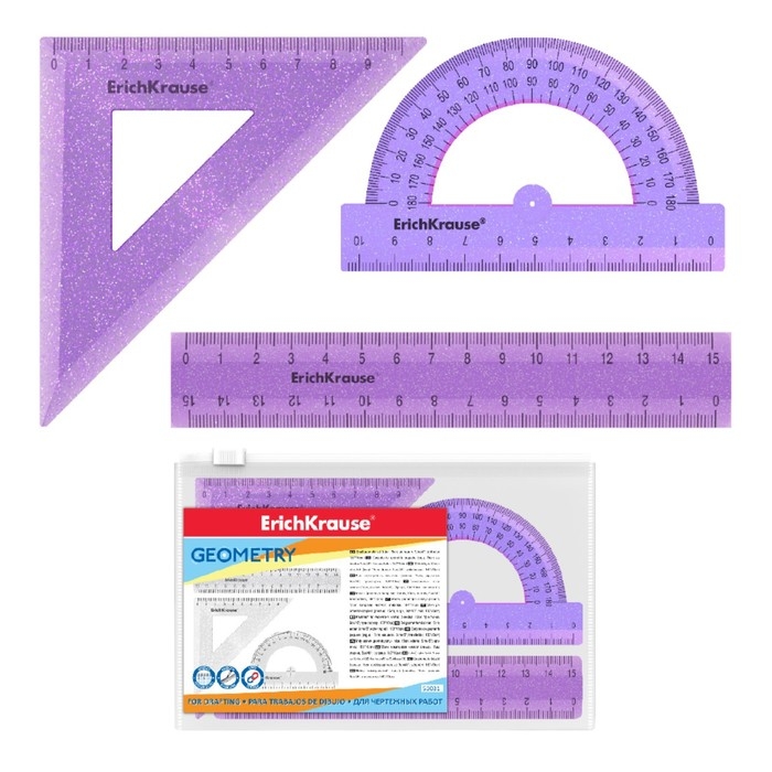Набор чертежный линейка 15см 3 пр ErichKrause Glitter, (угольник, трансп.), сирен, в zip-пак