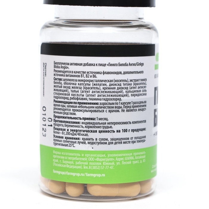 Гинкго Билоба Ангио + витамины В1, В2, В6, 60 - биологически активная добавка к пище, рекомендуется в качестве источника флавоноидов, дополнительного источника витаминов В1, В2 и В6.