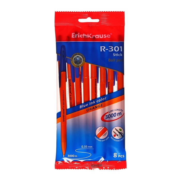 Набор ручек шариковых ErichKrause R-301 Orange Stick, 8 штук, узел 0.7 мм, цвет чернил синий