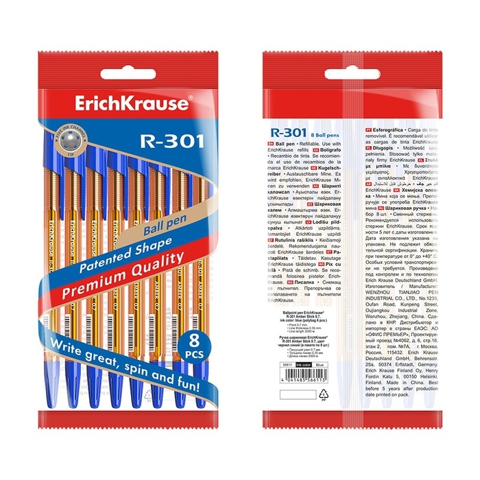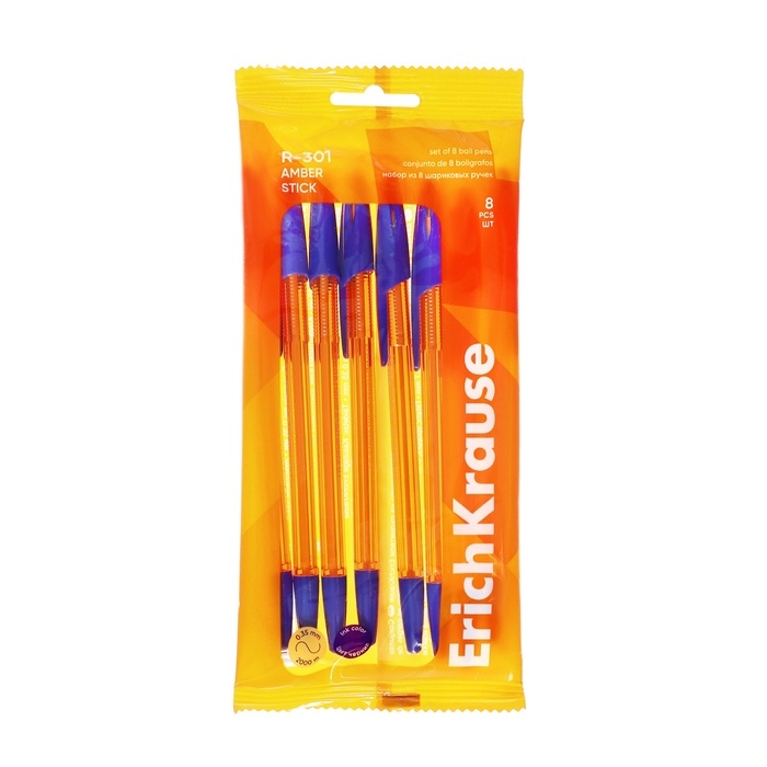 Набор ручек шариковых ErichKrause R-301 Amber Stick, 8 штук, узел 0.7 мм, цвет чернил синий