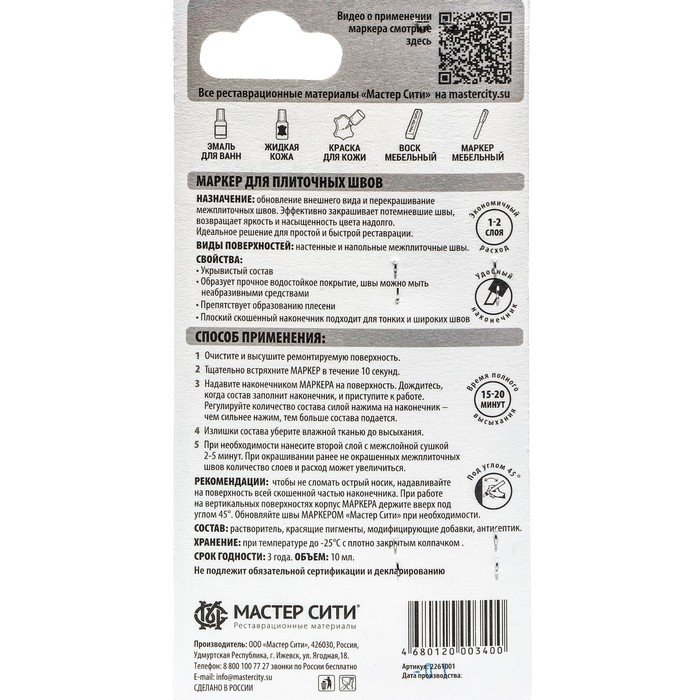 Маркер "Мастер Сити" для плиточных швов Белый №001 применяется для быстрого обновления внешнего вида межплиточных швов. Подходит для перекрашивания. Маркер эффективно закрашивает потемневшие швы, образует водостойкое покрытие, препятствует возникновению плесени. Используйте белый корректор для затирки настенных и напольных межплиточных швов в домашних условиях.