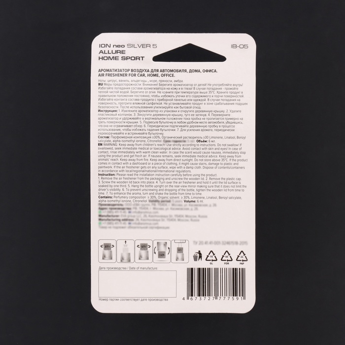 Ароматизатор подвесной бутылочка ION SILVER 5, 6 мл, IP-05