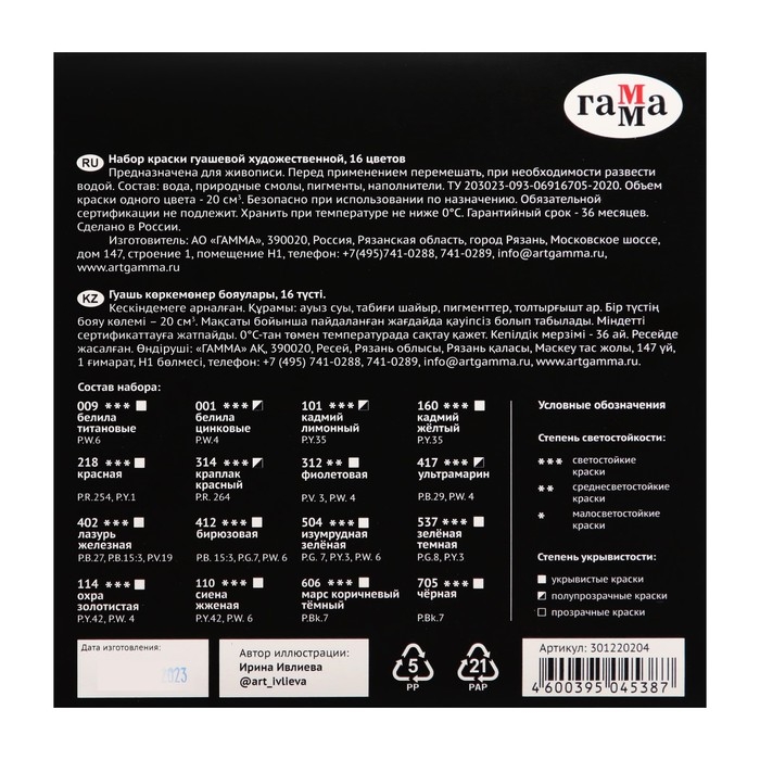 Гуашь художественная "Старый Мастер" - это профессиональные тонкотертые водорастворимые краски. Гуашь имеет уникальную рецептуру, разработанную в собственной исследовательской лаборатории завода совместно с художниками. Краска легко наносится на поверхность, благодаря специальным добавкам сохраняет яркость цвета после высыхания, создает плотный бархатный слой. Краска изготовлена из традиционных художественных пигментов, в том числе пигментов кадмиево-кобальтовой группы. В наборе оптимальная палитра цветов, подобранных профессиональными художниками. Набор 16 цветов, банка 20 мл.