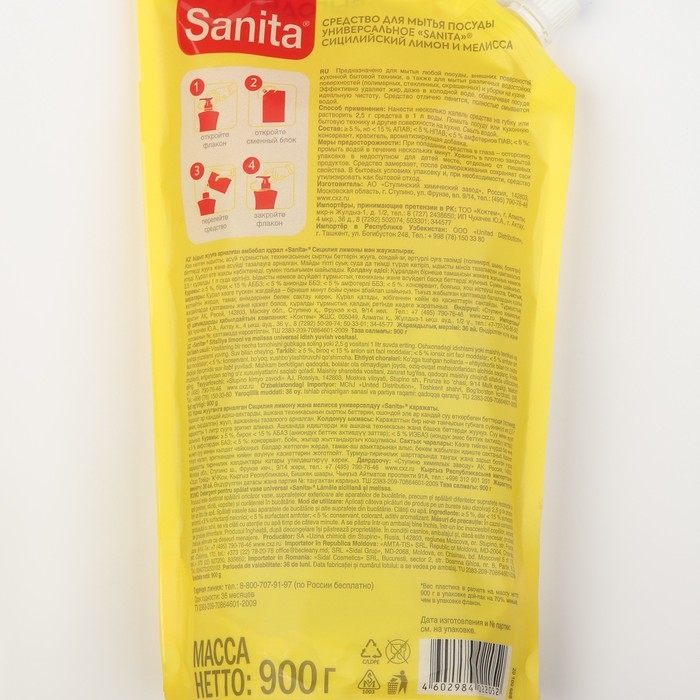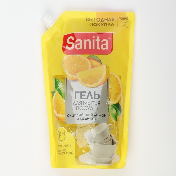 Гель для мытья посуды SANITA "Сицилийский лимон и мелисса", дой-пак, 900 г