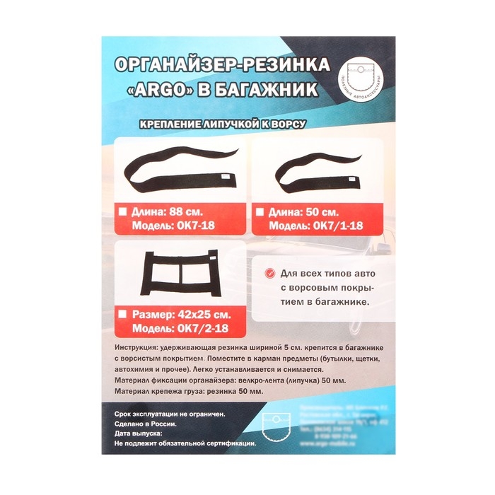 Органайзер-резинка для багажника — это крепление для вещей в багажнике на липучке с резинкой. Предназначена для надежной фиксации груза и вещей в багажном отделении вашего автомобиля. Огнетушитель, аптечка, канистра с маслом или антифризом, омывающая жидкость и другие предметы больше не будут свободно перемещаться в багажнике. Крепление надежно фиксируется в любом удобном месте при наличии ворсового покрытия, просто в установке и крайне удобно для фиксации предметов. Плотная резинка позволяет растягиваться креплению, тем самым давая возможность закреплять более объемные грузы.