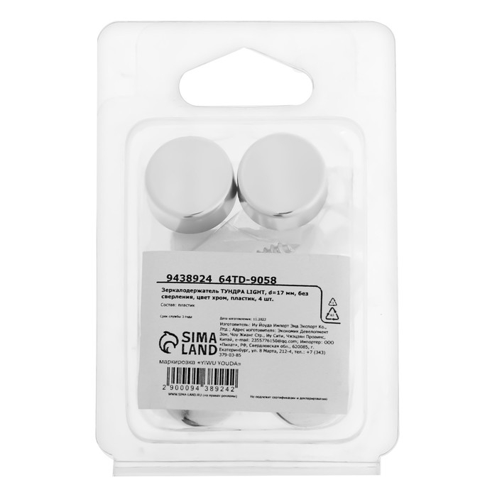 Зеркалодержатель ТУНДРА LIGHT, d=17 мм, без сверления, цвет хром, пластик, 4 шт.