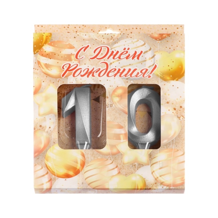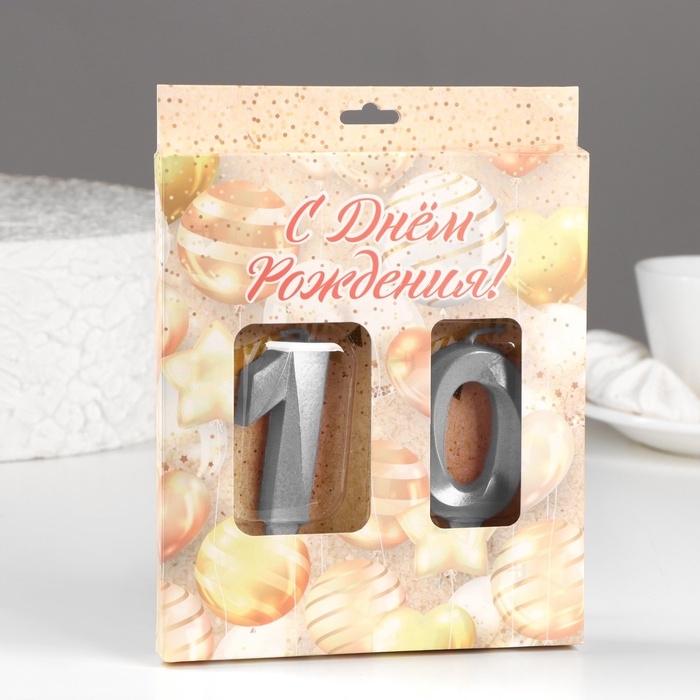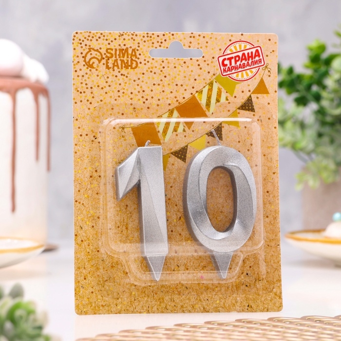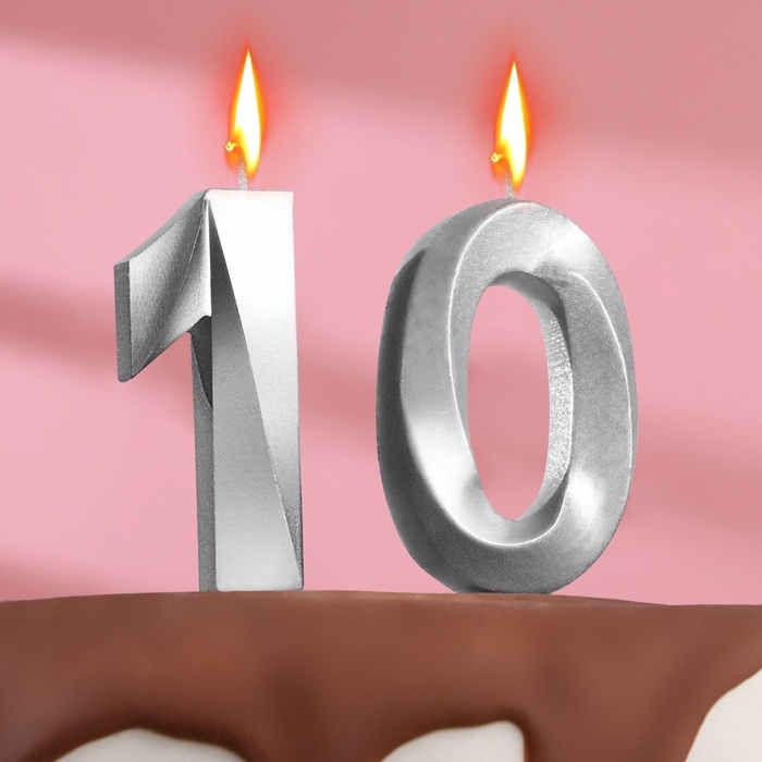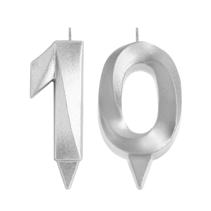 Свеча в торт юбилейная "Грань" (набор 2 в 1), цифра 10, серебряный металлик, 6,5 см