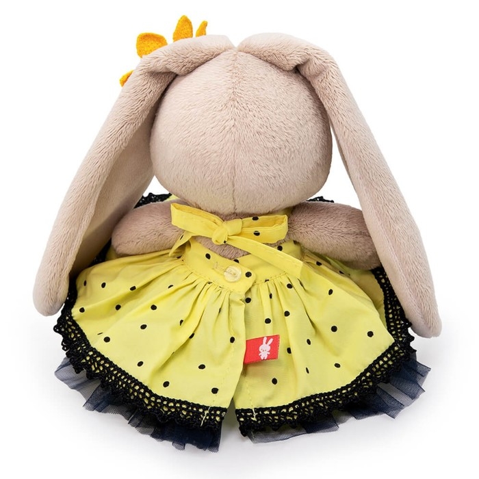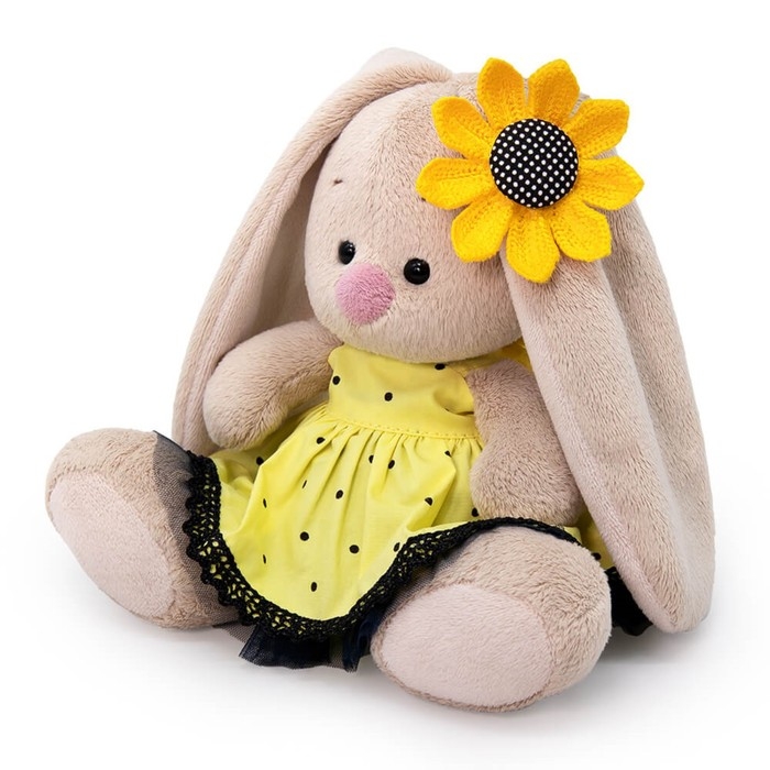 - На зайке жёлтенькое в черный горошек платьице без рукавов. На ушке яркий аксессуар — объёмный подсолнух.