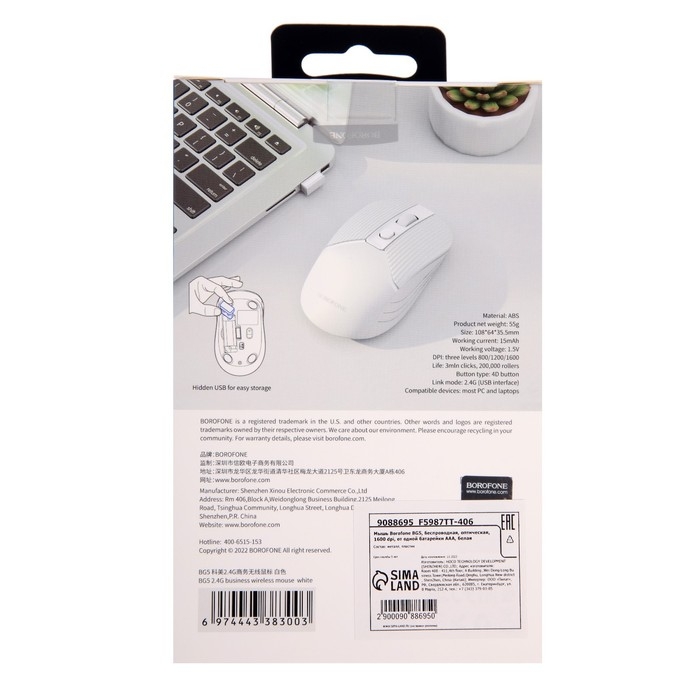 Мышь Borofone BG5, беспроводная, оптическая, 1600 dpi, от одной батарейки ААА, белая