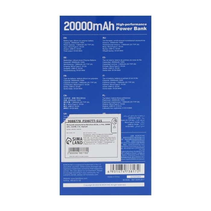 Внешний аккумулятор Borofone BJ3A, Li-Pol, 20000 мАч, 2хUSB, 2 А, чёрный