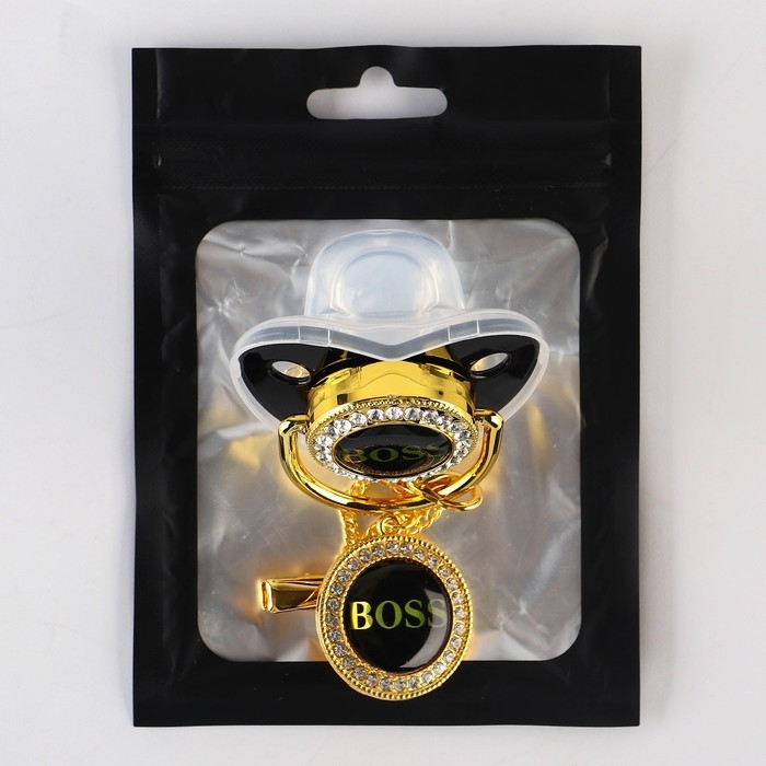 Соска - пустышка силиконовая ортодонтическая «BOSS», от 6 мес., с колпачком + держатель - цепочка, цвет черный/золото, стразы