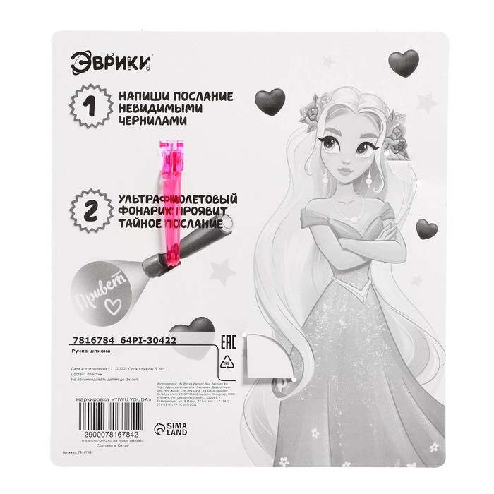 Ручка шпиона «Принцесса», с блокнотом, невидимые чернила, ультрафиолетовый фонарик