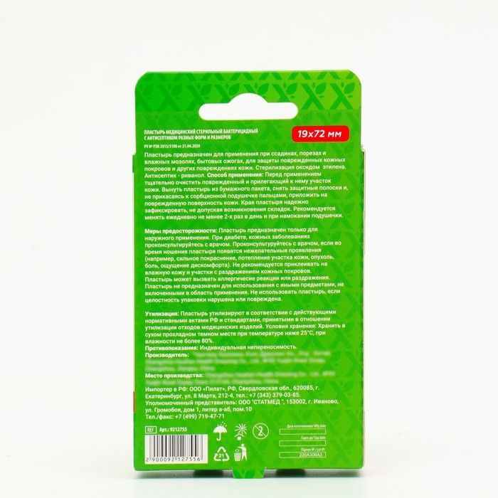 Пластырь предназначен для применения при ссадинах, порезах и влажных мозолях, бытовых ожогах, для защиты поврежденных кожных покровов и других повреждениях кожи. Стерилизация оксидом этилена. Антисептик - риванол.