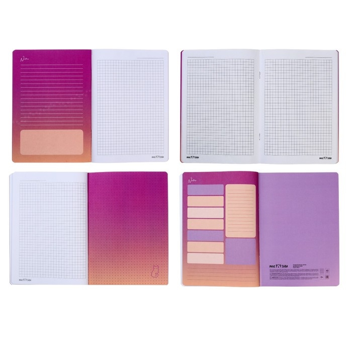 Тетрадь общая формата А5 (150 х 210 мм) на скобе, 40 листов. Внутренний блок – офсет 65 г/м2, белизна 100%, клетка с полями. Обложка тетради из импортного целлюлозного картона выделяется милым дизайном и цветной запечаткой форзаца. Отделка обложки - матовая ламинация, тиснение фольгой. Подкладные листы, на которых удобно записывать важные заметки, являются логичным продолжением общего дизайна тетради.