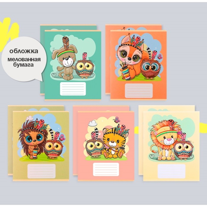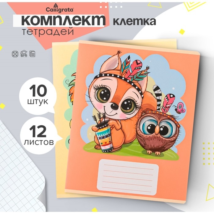 Комплект тетрадей из 10 штук, 12 листов в клетку Calligrata "Животное племя", обложка мелованная бумага, ВД-лак, блок офсет, 5 видов по 2 штуки