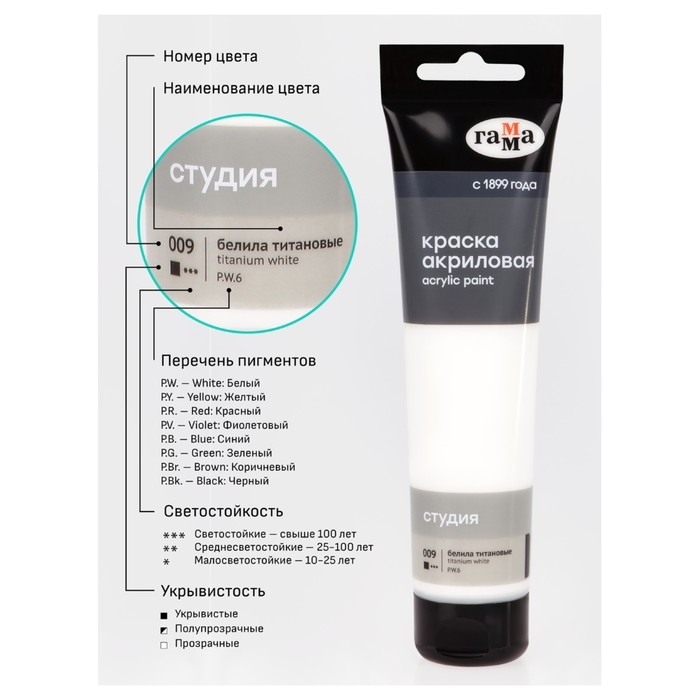 Краска акриловая художественная 110 мл, Гамма "Студия" №009 белила титановые