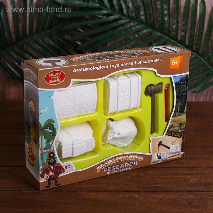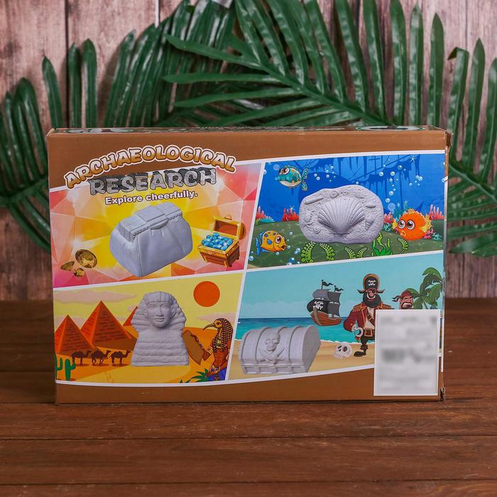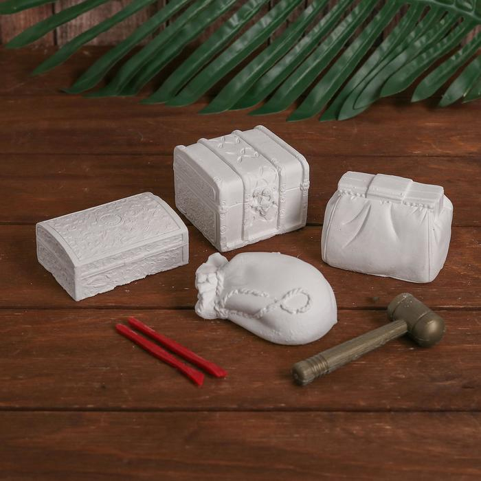 В наборе есть кисточка, долото, 4 гипсовых объекта с кладом внутри.