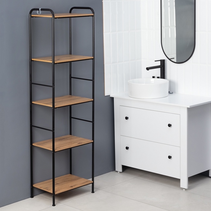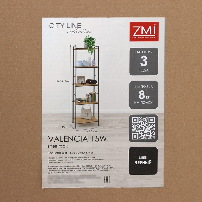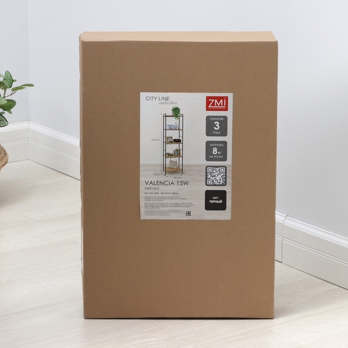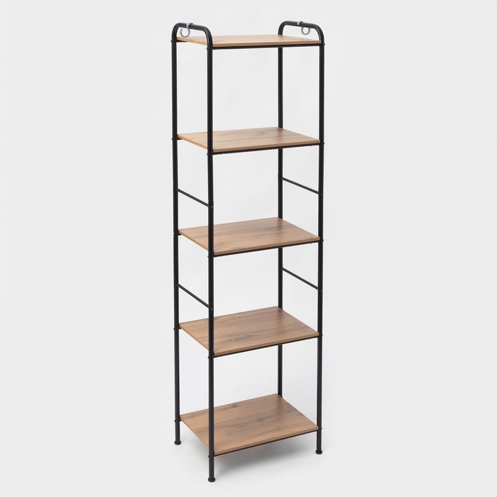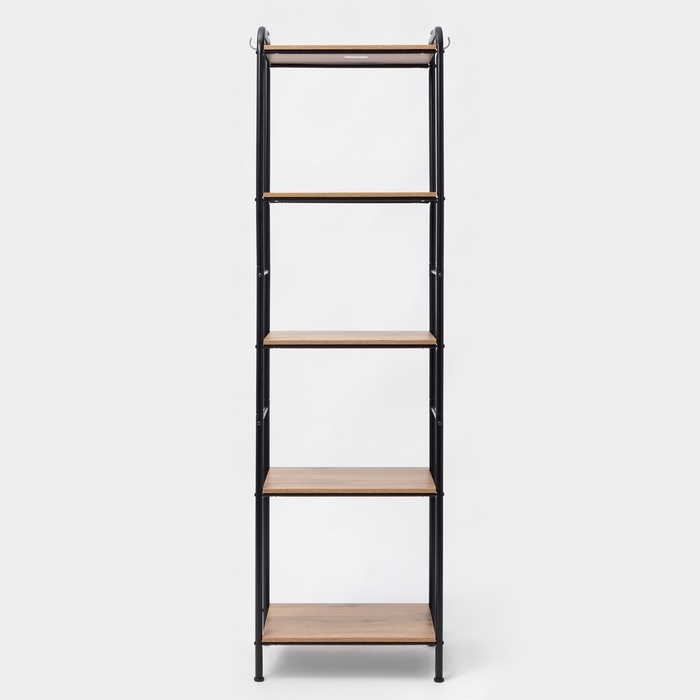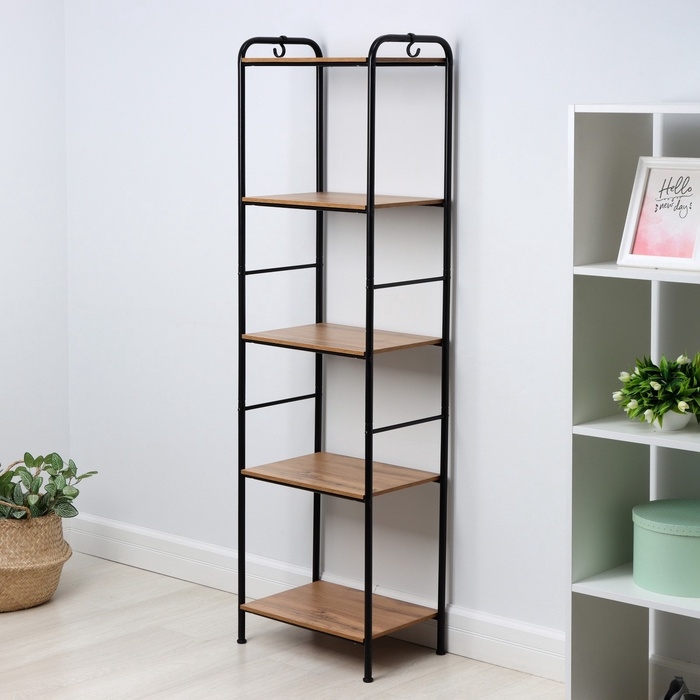Система хранения имеет 5 полок из ЛДСП, каждая из которых выдерживает нагрузку до 8 кг.