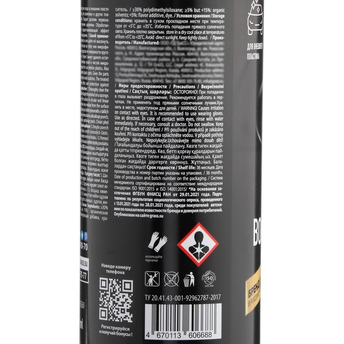 Состав на силиконовой основе для ухода за внешним пластиком автомобиля. Так же подходит для резиновых и других пластиковых неокрашенных деталей. Придает деталям первоначальный вид, блеск, маскирует мелкие царапины. Обработанная поверхность приобретает водоотталкивающий эффект и защиту от преждевременного выгорания.