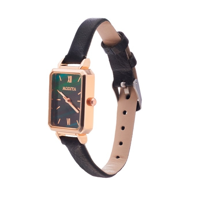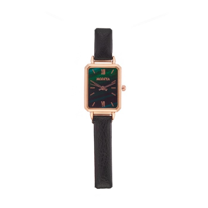 Женские кварцевые часы с чёрным ремешком и циферблатом с рисунком зелёного мрамора – изысканность и стиль в одном изделии