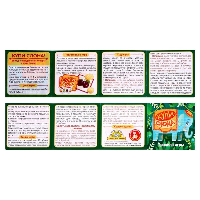 Учитесь считать до 20, вести денежные расчёты и выгодно продавать свои товары вместе с развивающей бизнес-игрой на кубиках для малышей «Купи слона»!