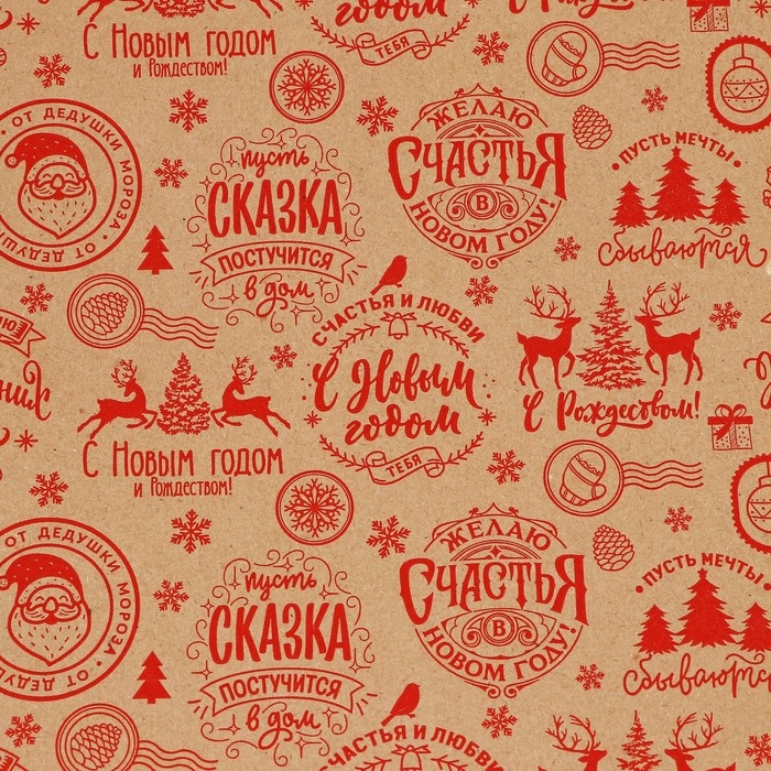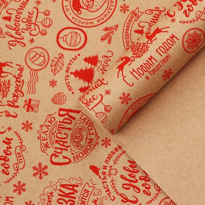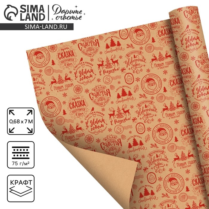 Бумага крафтовая в рулоне «Желаю счастья в Новом году», 0.68 х 7 м