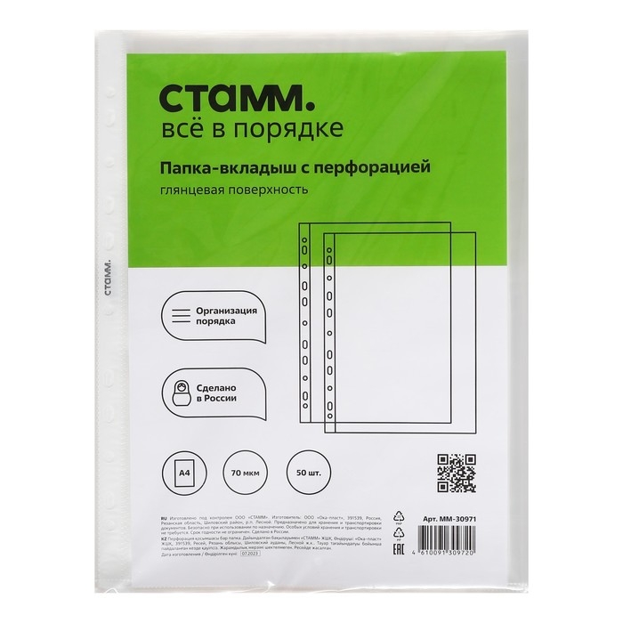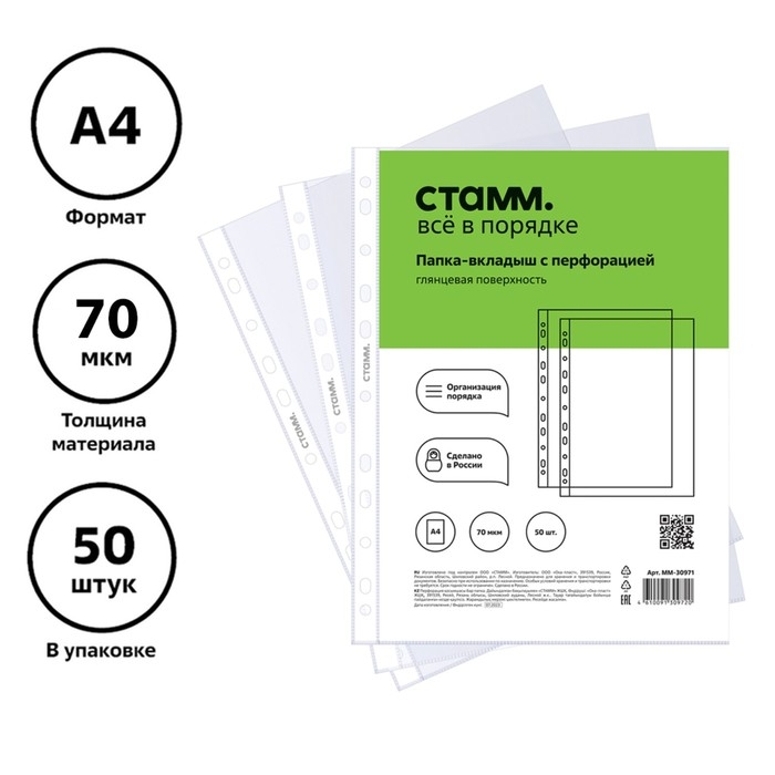 Файл-вкладыш А4, 70 мкм Стамм, глянцевый, вертикальный, 50 штук