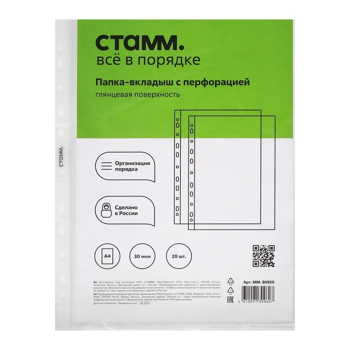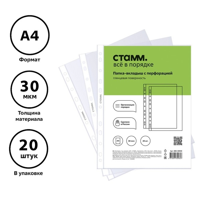 Перфорация на боковой части позволяет разместить изделие в папке с любым кольцевым механизмом или скоросшивателем. Упакованы в пакет по 20 штук.