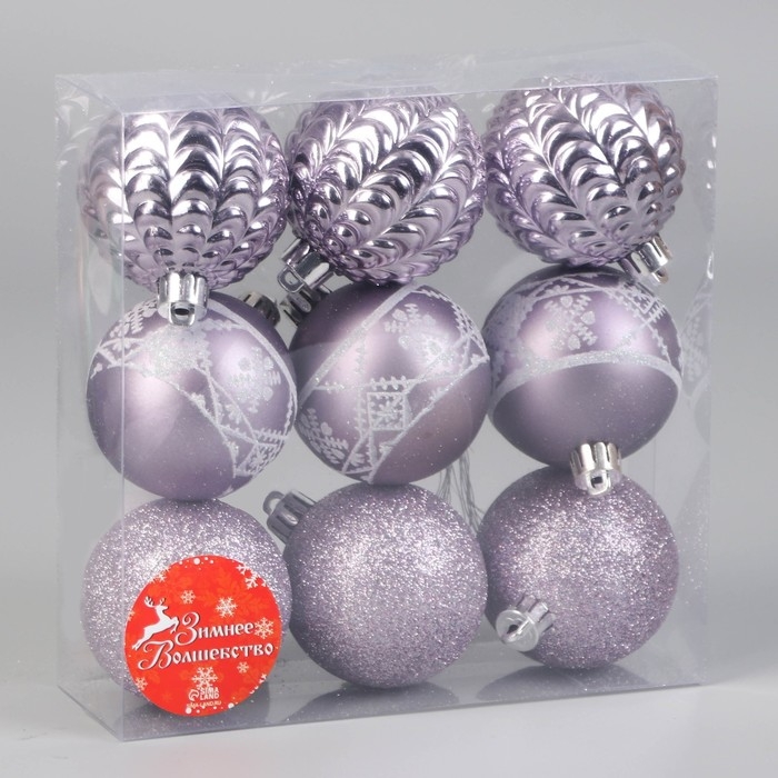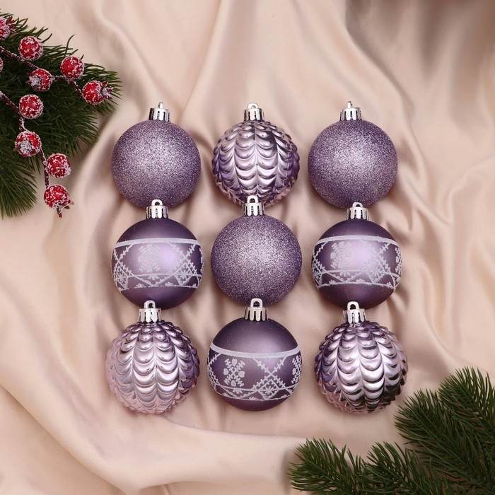 Ёлочные игрушки, шары новогодние , пластик, набор d-6 см, 9 шт "Изабель" узоры, сиреневый