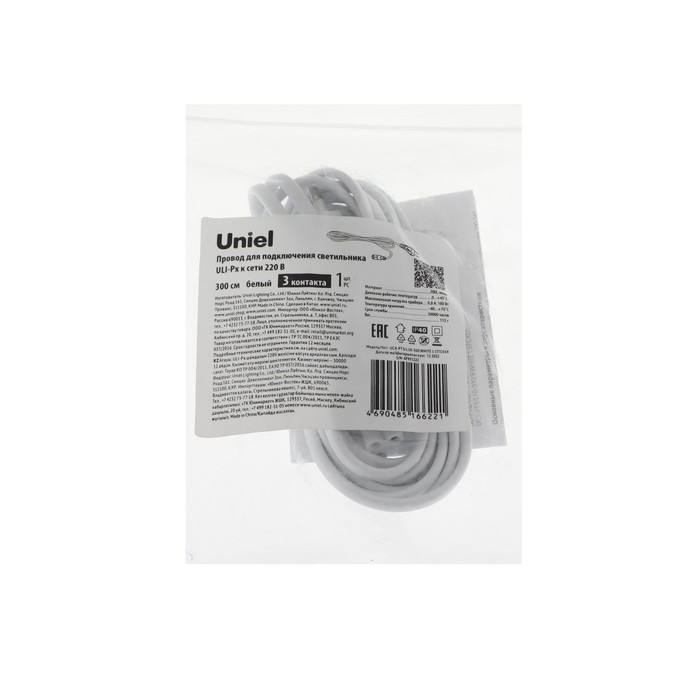 Провод для подключения светильника ULI-P* к сети 220В Uniel, 300 см, 3 контакта, белый