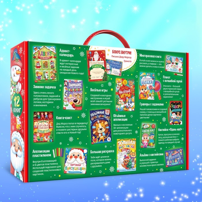 В набор входит целых 12 книг: гравюры, большой плакат с лупой, альбомы с наклейками, многоразовая книга «пиши-стирай» с маркером, объёмные аппликации и аппликации с пластилином, раскраска, книга с аппликациями пластилином, новогодние задачки, игры, квест и адвент-календарь для весёлых зимних дней!