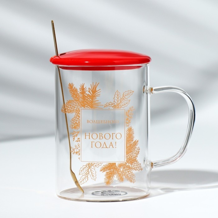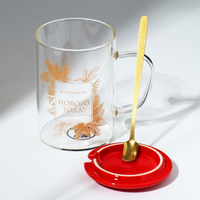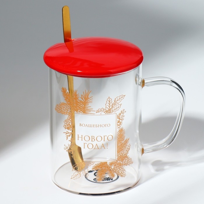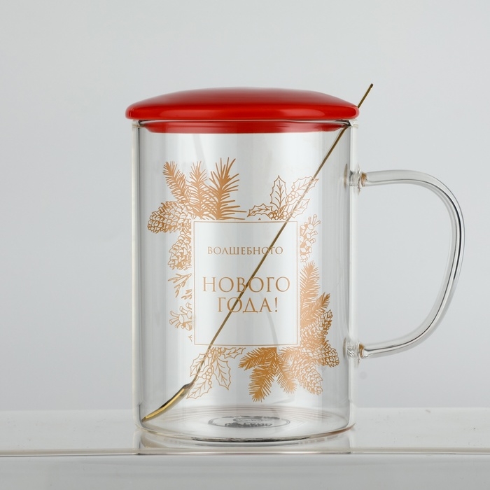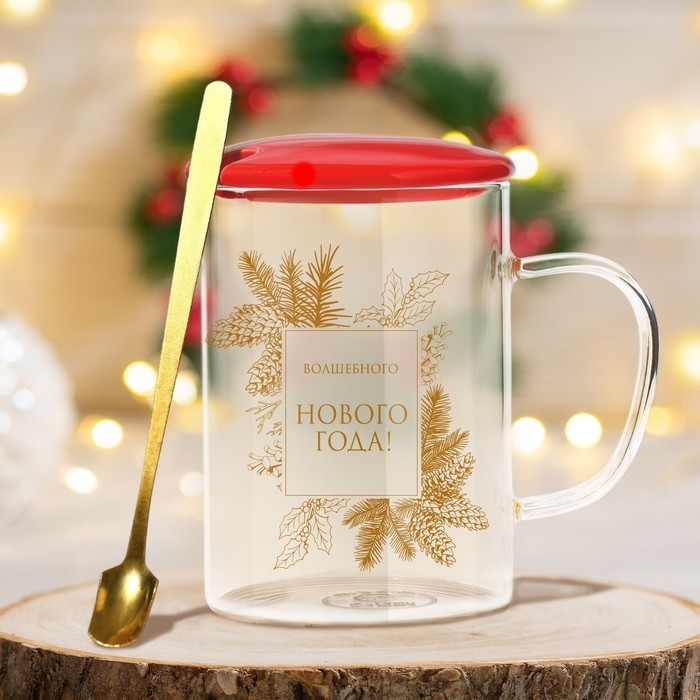Кружка с ложкой и крышкой стеклянная Дорого внимание «Волшебного нового года», 470 мл