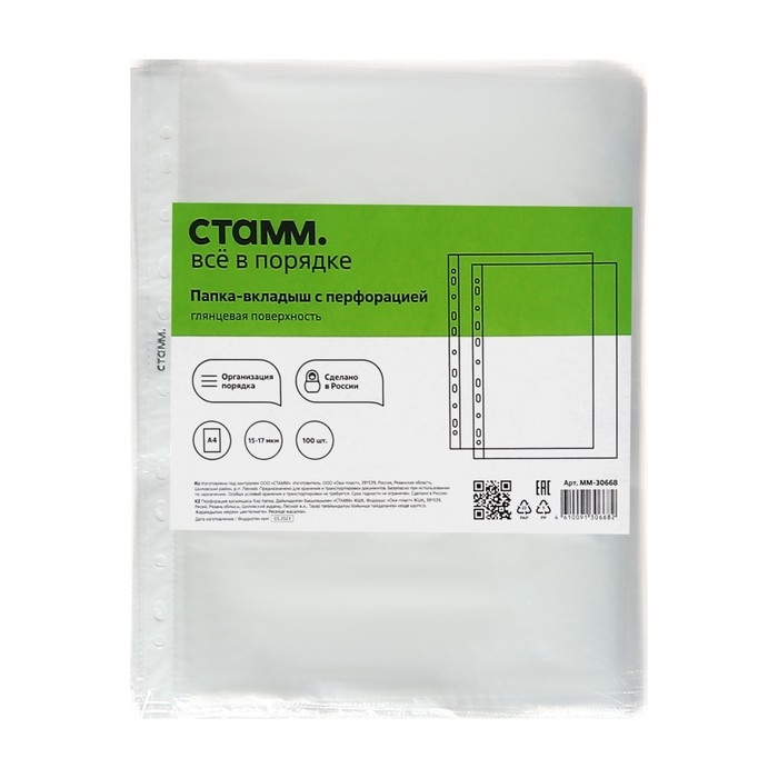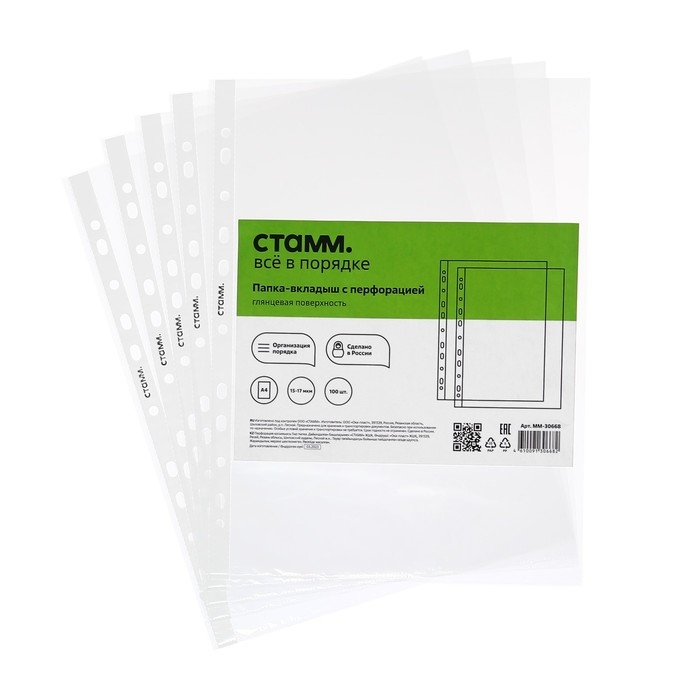 Папка-вкладыш с перфорацией «СТАММ» отлично подойдет для хранения и систематизации документов. Папка размером 305 х 235 мм изготовлена из полипропилена толщиной 15 - 17 мкм. Папка вмещает до 50 листов. Имеет глянцевую текстуру, защищает листы от внешних воздействий. Перфорация на боковой части позволяет разместить изделие в папке с любым кольцевым механизмом или скоросшивателем. Упакованы в пакет по 100 штук.