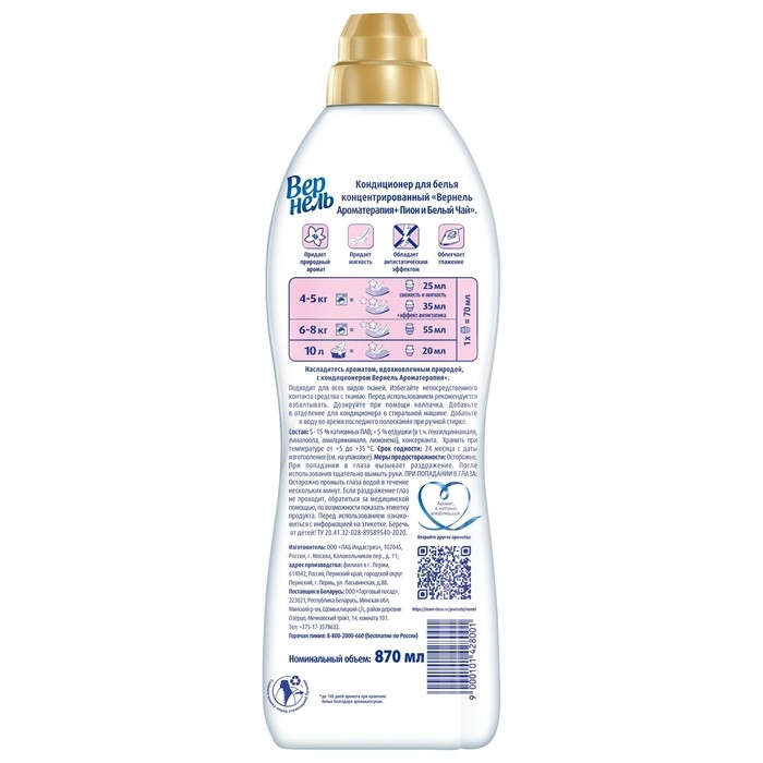 Кондиционер для белья Vernel - это отличное средство для ухода за вашей одеждой. Он обладает антистатическим эффектом, облегчает глажку и придает белью мягкость и свежесть. Vernel также обладает приятным ароматом, который сохраняется на белье после стирки.