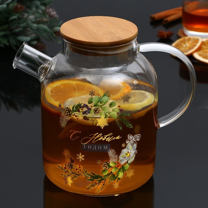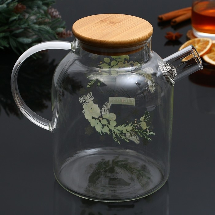 Новогодний стеклянный заварочный чайник с бамбуковой крышкой и объёмом 1700 мл — это стильный и функциональный аксессуар для вашей кухни.