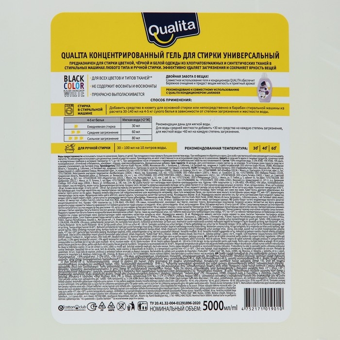 - Универсальность: QUALITA гель подходит для стирки различных видов тканей, включая хлопок, синтетику, шерсть, и даже деликатные ткани. Он способен справляться как с повседневной одеждой, так и с более нежными вещами.