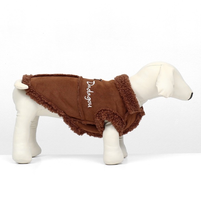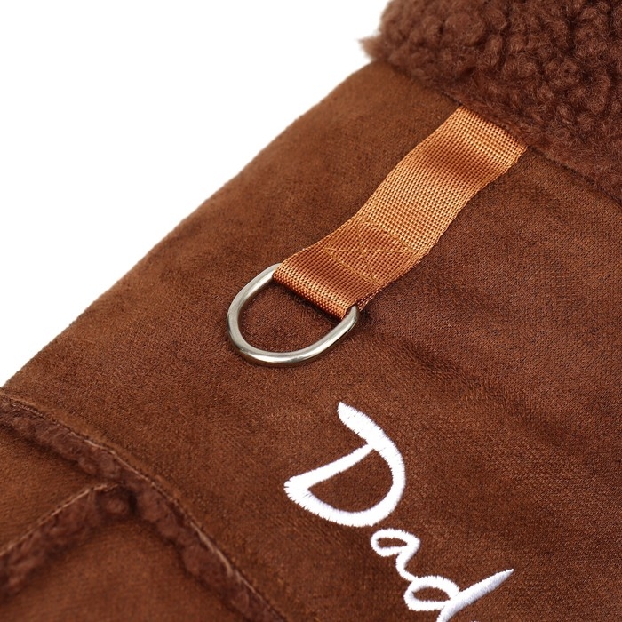 Представлена в коричневом цвете со стильной вышивкой на спинке. Внутри дублёнки тёплый подклад, На спине имеется кольцо для поводка, что облегчит подготовку к прогулкам.