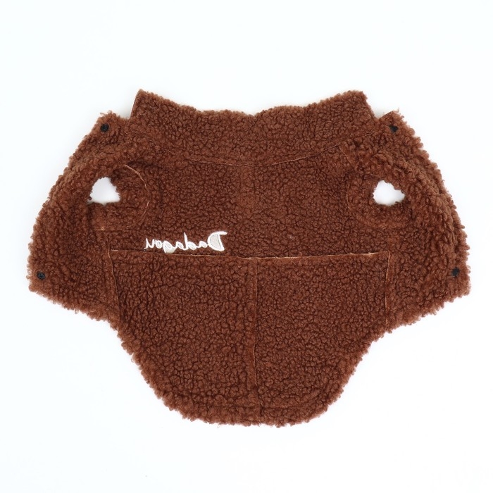 Представлена в коричневом цвете со стильной вышивкой на спинке. Внутри дублёнки тёплый подклад, На спине имеется кольцо для поводка, что облегчит подготовку к прогулкам.