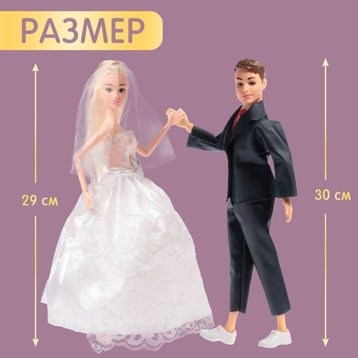 Размеры кукол: жених — 9 × 3,5 × 30 см; невеста — 7,5 × 3 × 29 см. Игрушки на шарнирах.
